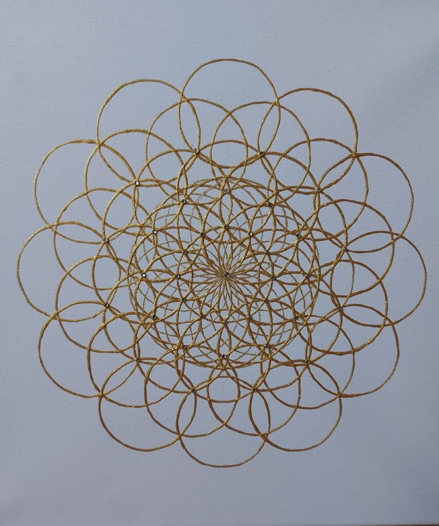 Die Lebensblüte gibt es in verschiedenen Größen auf Keilrahmen mit Acryl Gold gemalt und mit Kristallen versehen.